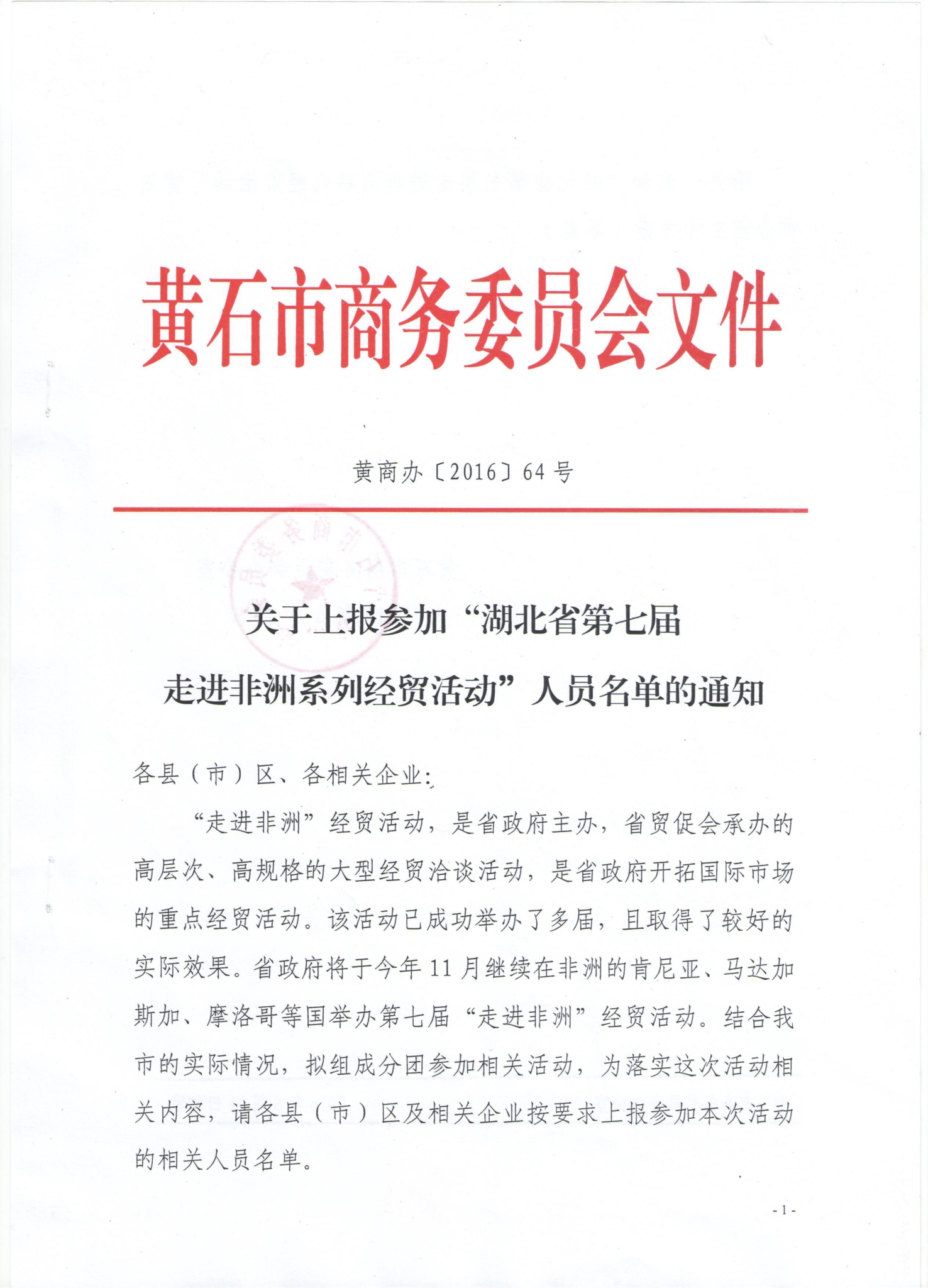 关于上报参加“湖北省第七届走进非洲系列经贸活动”人员名单的通知