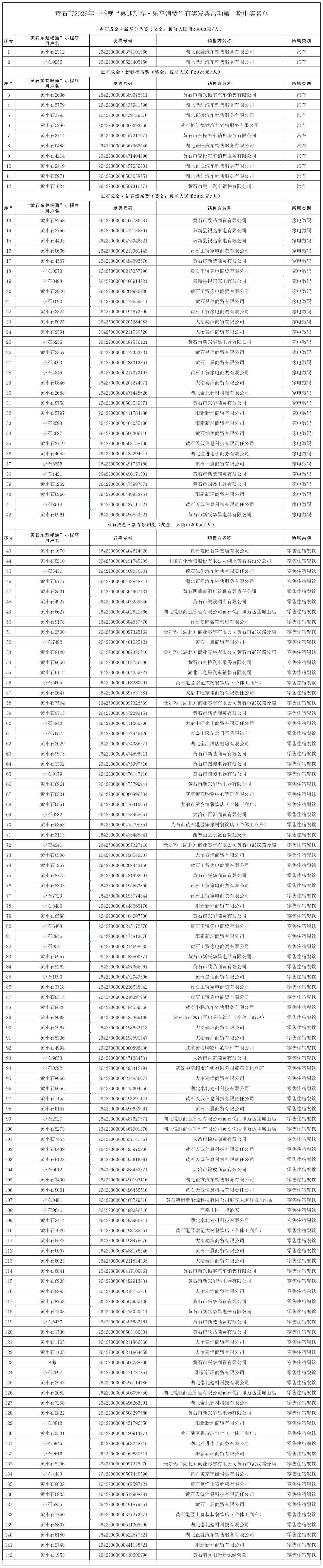 本期开奖对象为2026年1月31日至2月10日期间,在我市参与活动商户消费、开具并上传至“黄石东楚畅通”微信小程序对应抽奖系统的合规有效发票。经系统初核、人工复核、现场抽奖、公证监督等程序,本期共产生中奖者142名。具体奖项如下: